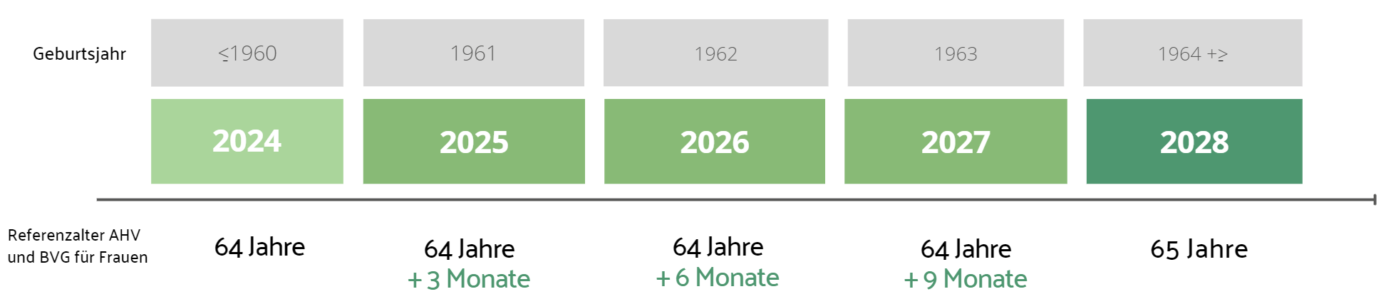 Zusammengefasst wird das Referenzalter für den Rentenbezug von Frauen ab 2025 auch in der zweiten obligatorischen Säule schrittweise angehoben. Die Vereinheitlichung des Referenzalters von 65 Jahren für Frauen und Männer wird 2028 erreicht sein.