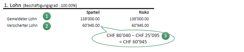 Dieser Abschnitt weist Ihren gemeldeten Lohn (1) (d.h. Ihren AHV-pflichtigen Bruttolohn) und Ihren versicherten Lohn (2), in der Regel Ihren gemeldeten Lohn minus eines allfälligen Koordinationsabzugs (3) (maximal CHF 25'095.- im Jahr 2021) aus. Der Koordinationsabzug kommt zur Anwendung, um Doppelversicherung zu vermeiden, da ein Teil der Altersleistungen bereits durch die AHV abgedeckt ist. Andererseits sieht das Gesetz über die berufliche Vorsorge (BVG) vor, dass jener Teil des Lohns, der zwischen dem Koordinationsabzug und der BVG-Lohnobergrenze (2021: CHF 86'040.-) liegt, zu versichern ist. Wobei sich die Unternehmen oftmals für grosszügigere Lösungen entscheiden und auch Lohnanteile oberhalb dieser Obergrenze versichern.